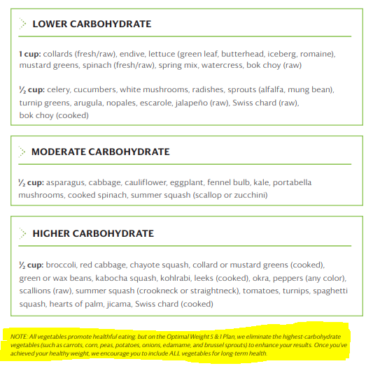 Even though you are able to incorporate some fresh ingredients with the “Lean and Green” meal, there are oddly specific guidelines about which vegetables are allowed. According to Optavia, you must be careful of high-carbohydrate vegetables like carrots, onions, and brussels sprouts. I mean, it would be a shame if you overdid it on the carrots! (p.s. that was sarcasm. Carrots, onions, and brussels sprouts are non starchy vegetables, meaning they are quite low in carbs).